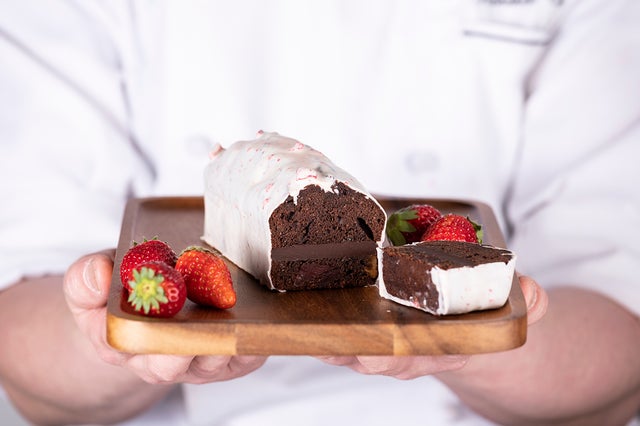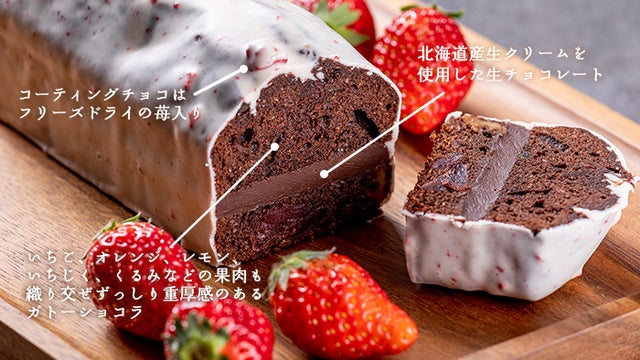 厚木農園の苺をピューレにして生地に練り込み、イチゴ、オレンジ、レモン、イチジク、くるみの異なる食感も楽しめるようにふんだんに入れ、2種類のチョコレイトのブレンドとサンドされた生チョコレイトを2日かけてなじませ丁寧に焼き上げたガトーショコラ!!