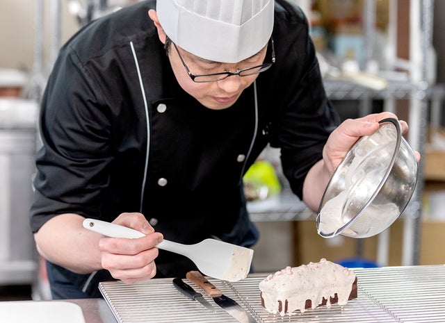 __ 大変に美味しい【厚木農園】紅ほっぺ、かおり野、章姫苺をピューレにして、蜂蜜やアーモンドパウダーと共に生地に練り込み、食感の良いフルーツや、ナッツなどをふんだんに使用して焼き上げました。このガトーショコラのこだわりはチョコレートで、【厚木農園】紅ほっぺ、かおり野、章姫苺ピューレをブレンドすることでより深みをだすことに実現しました。そして、今回の一番のポイントはガトーショコラの中に生チョコをサンドした点です。よりチョコレート感と食感にリズムが出て、今までに味わったことのないガトーショコラができたと自負しています。