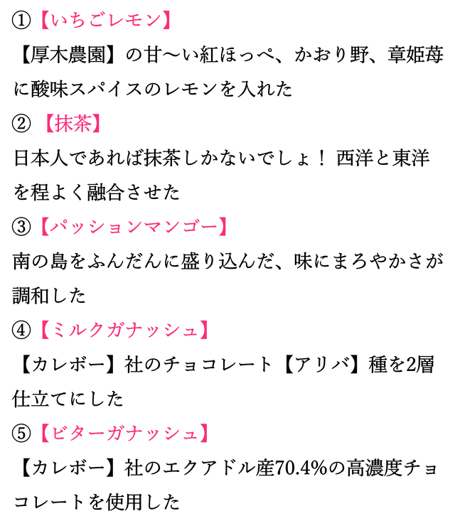 1,甘酸っぱい厚木農園の苺とレモン 2,濃厚な宇治抹茶とビターチョコレイト 3,程よい酸味にこだわったパッションマンゴーのガナッシュ 4,アリバ/幻のカカオを使用した魔法のミルクガナッシュ 5,エクアドル/香りの余韻が心地いいエクアドル産のカカオ分70.4%使用。