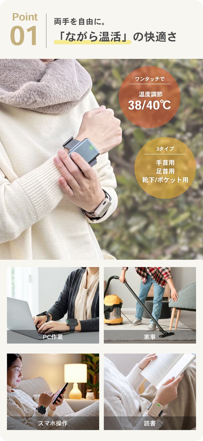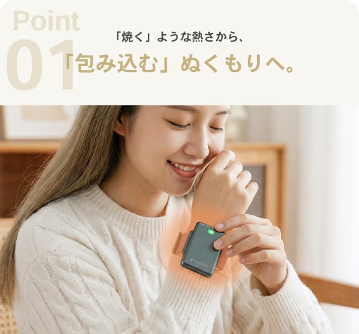 腕時計のように手首に巻くだけで、両手は自由なままぽかぽかに。