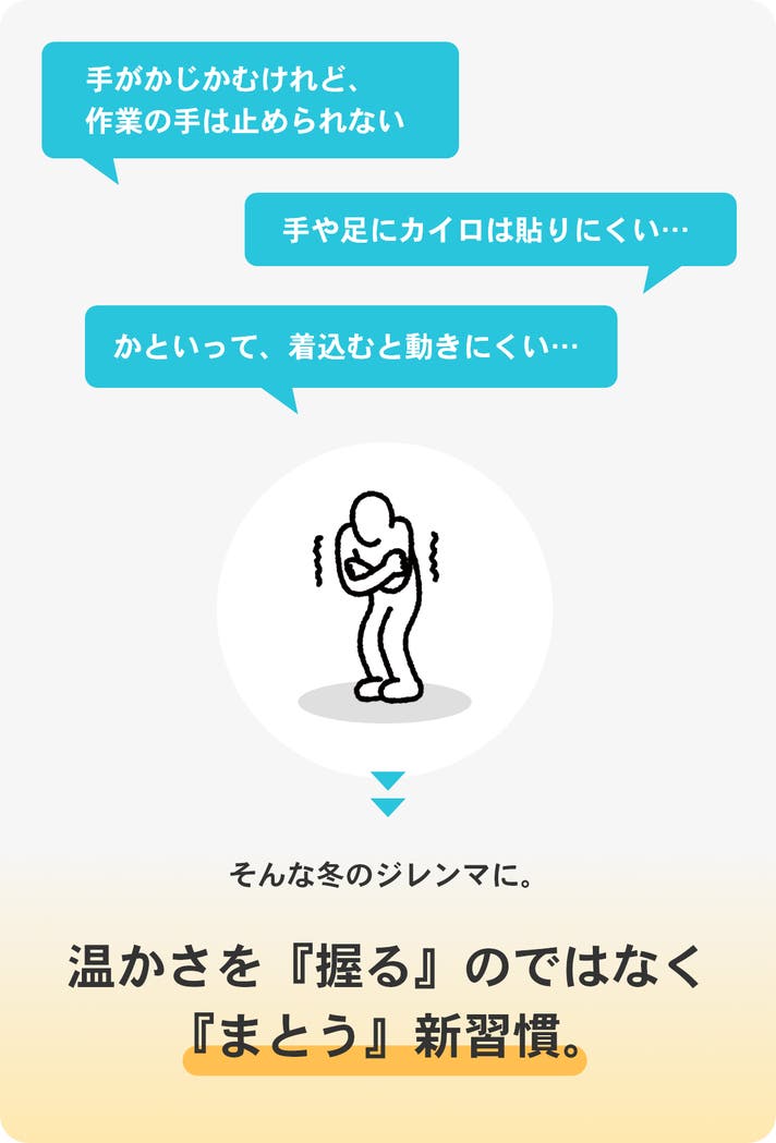 そんな冬のジレンマに、私たちは「温かさを握る」のではなく「温かさを纏(まと)う」という新しい解決策を提案します。