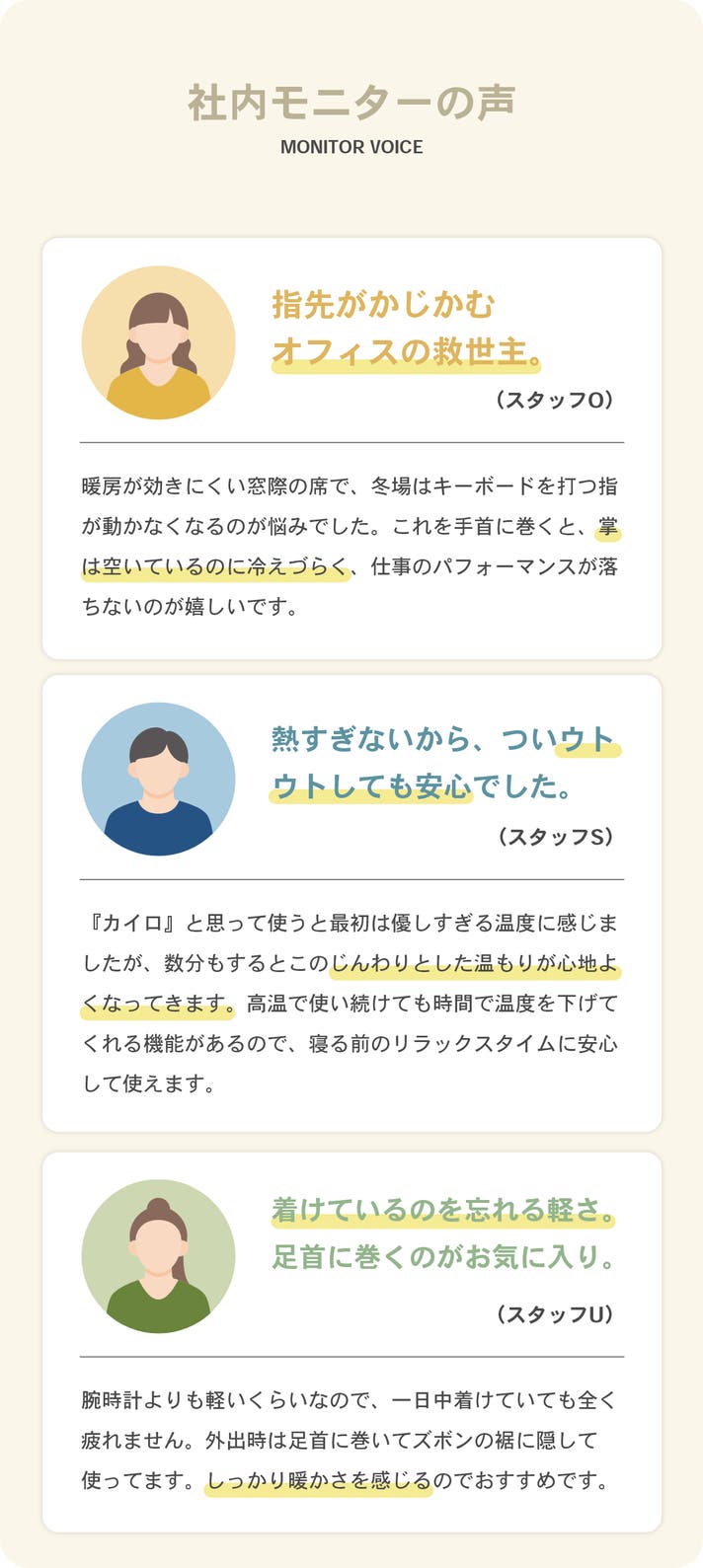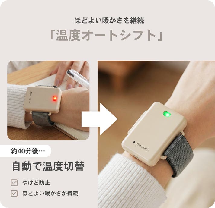自分で操作しなくても、TOMOSHIBIが「熱くなりすぎる」のを未然に防ぎ、ずっと着けていられる「ほどよい暖かさ」を持続させます。