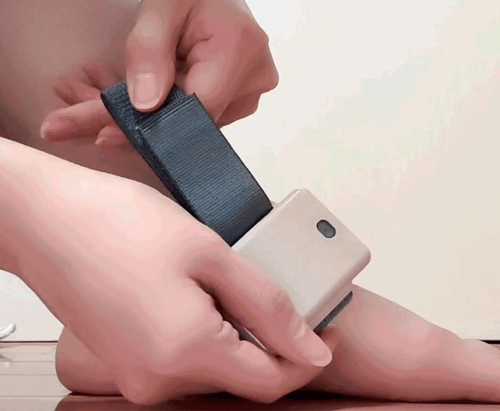 本体とバンドが一本の帯状になるので、靴の大きさに関係なく、足首に巻きつけるだけで装着完了。