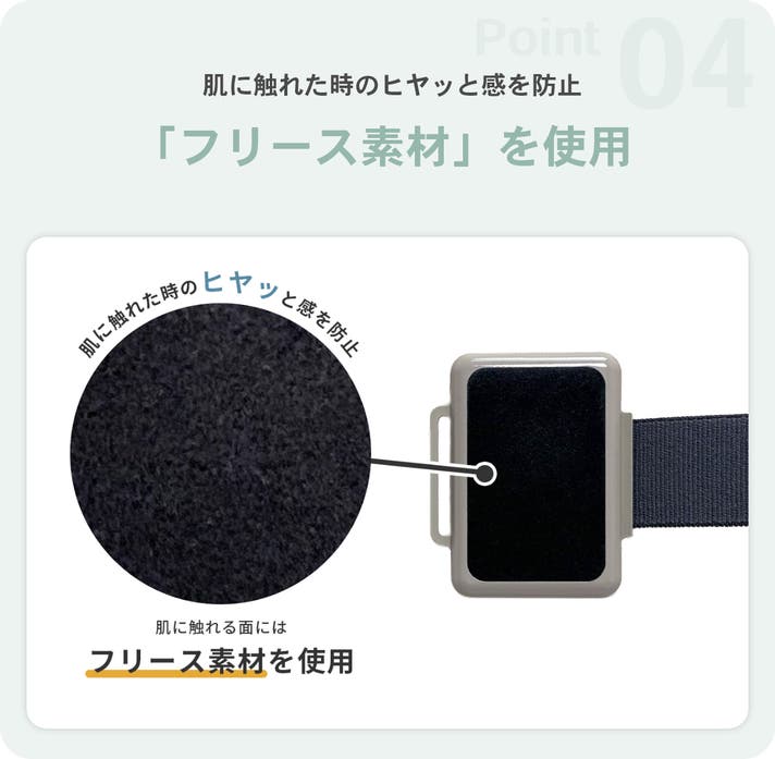 本体の肌に触れる面には、起毛したフリース素材を使用しました。