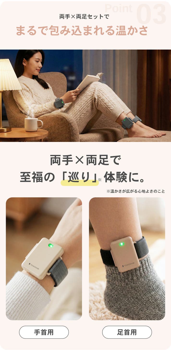 身体の末端である4点(両手首・両足首)を同時に温めることで、まるで温かい毛布にくるまっているような、至福の「巡り(※)」体験を提供します。