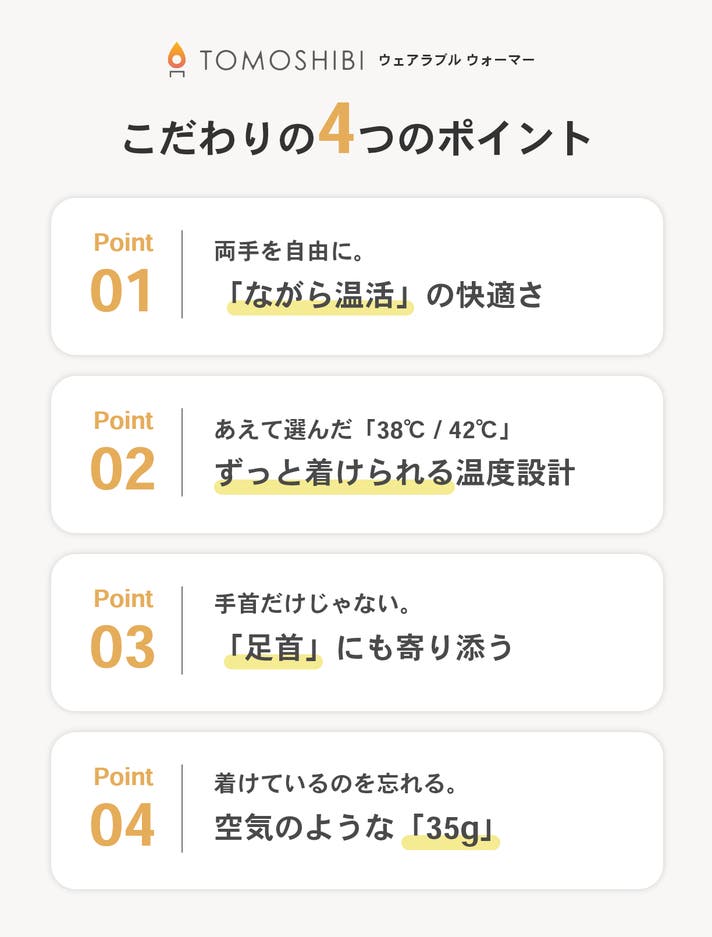 TOMOSHIBIは、長時間着けたままでも心地よい『体温+α』の黄金比を追求しました。