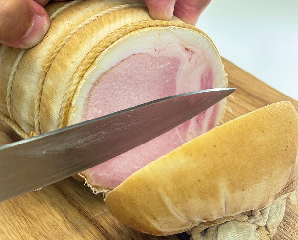 ケーシング(原料肉を詰める袋状のもの)を使用したロースハムと違い、布で巻き上げることにより肉の水分が適度に保持され、しっとりとした食感をお楽しみいただけ、脂身の美味しさがわかることが特徴です。
