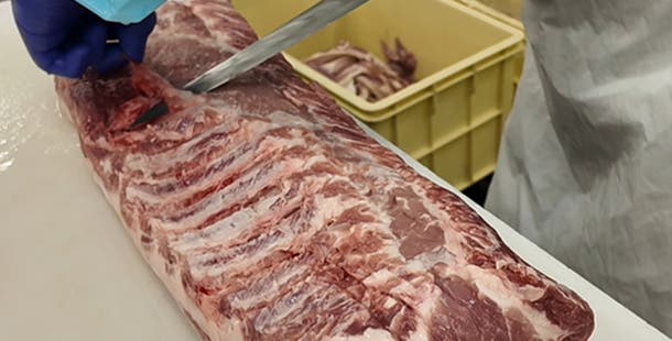 赤身内に霜降りが入りやすく、やわらかい肉質と深い味わいが特徴のロース肉を使用し、余分な脂やスジ、子骨を取り除き、肉を整形していきます。
