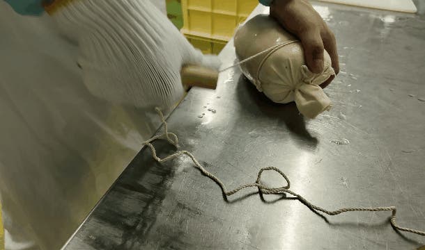 手作業で1本1本肉を布で包み、糸で巻き上げていきます。