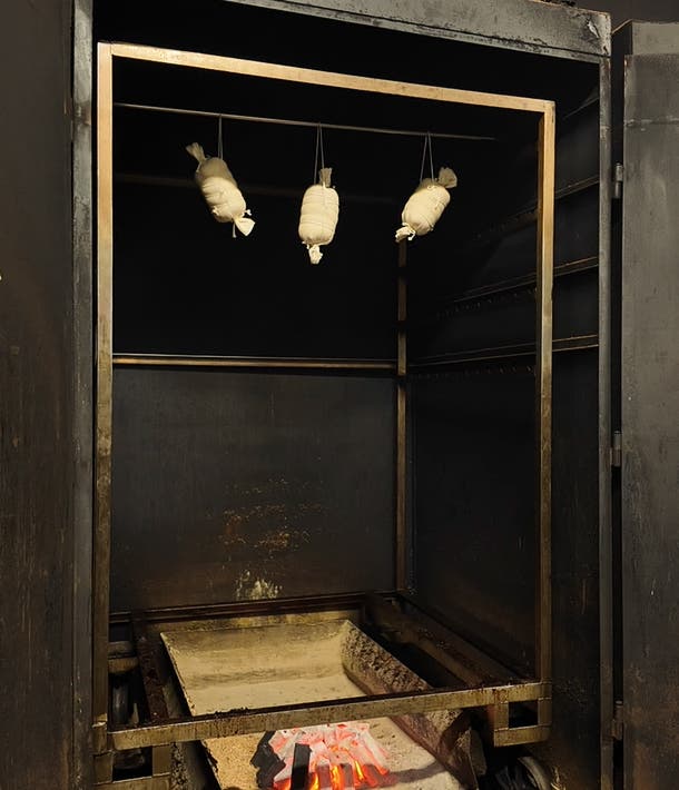 2時間以上の乾燥工程を経た後、炭火の残り火で燻煙工程を行います。