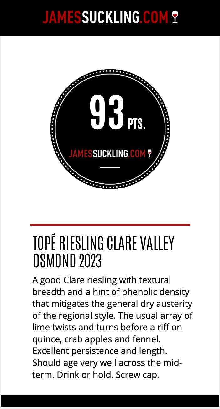 世界的ワイン評論家として大きな影響力を持つジェームス・サックリング氏が立ち上げたワイン評価サイトで、去年発売したTOPE 100 オズモンド・リースリング 2023は、93点を獲得!(新ヴィンテージも今後評価してもらう予定です)