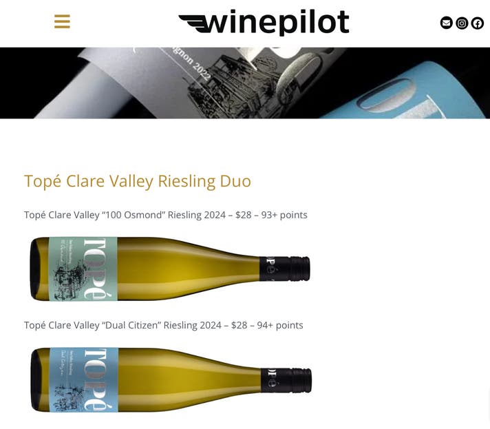 オーストラリアのワイン評価サイト「ワイン・パイロット」では、皆さんにお届け予定の新ヴィンテージ2024年のリースリングを評価していただき、100 オズモンド・リースリングは、93点!TOPE デュアル・シチズン・リースリングは、94点を獲得しました!