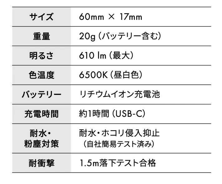 わずか20gという超軽量ながら、最大610ルーメンの圧倒的な光量を誇り、暗闇でもしっかりと視界を確保。キャンプや登山はもちろん、災害時や夜道での帰宅など、日常のあらゆるシーンで活躍します。