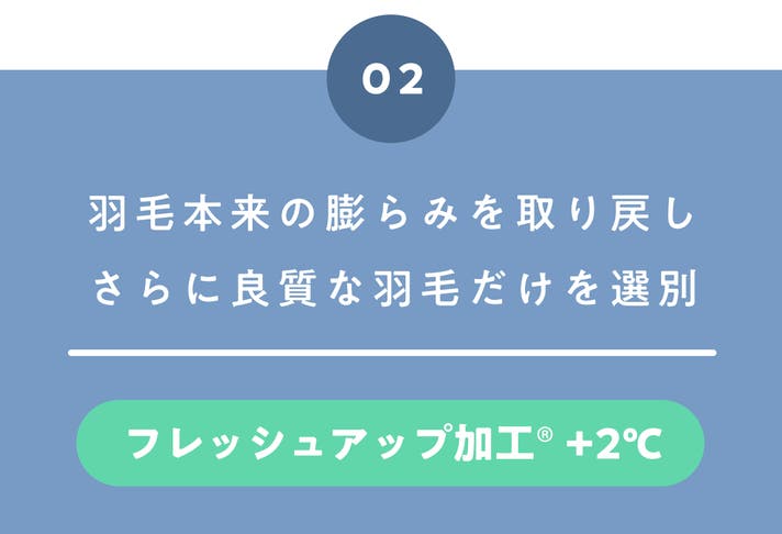 ウルトラファインバブル・超軟水での加湿乾燥を繰り返し、髪の毛を優しくブローするように羽毛を温風で乾かしふっくらと仕立て上げます。ダウンが開くことで、より細かい不純物まで取り除き、ほこりの発生量も減少します。