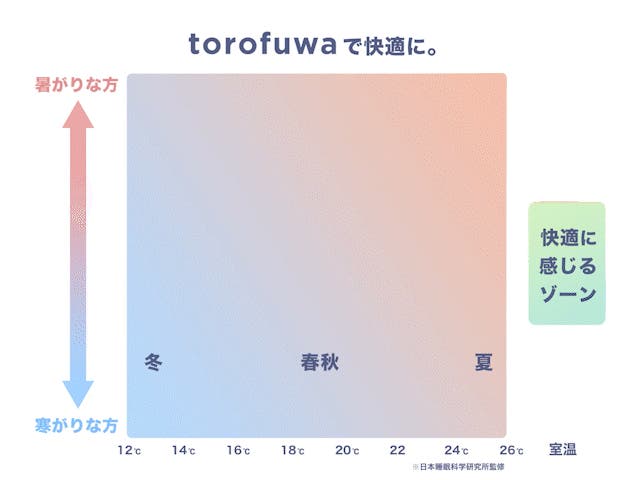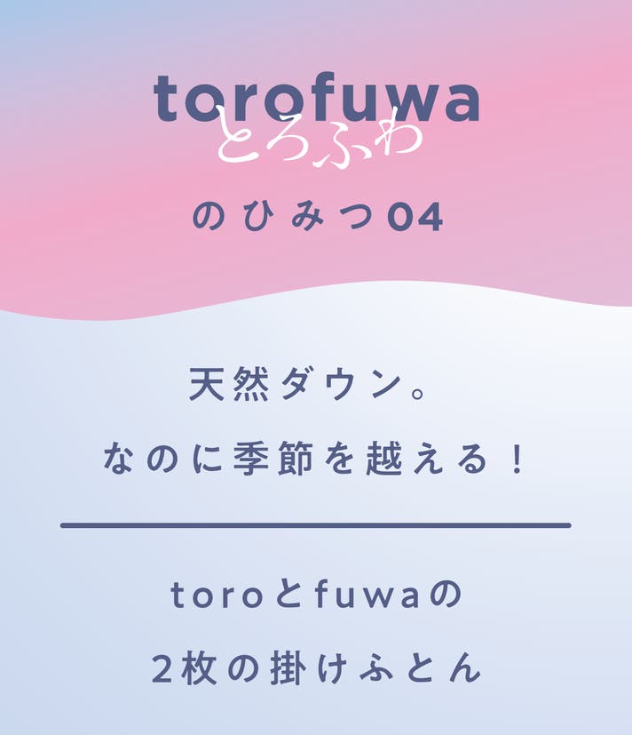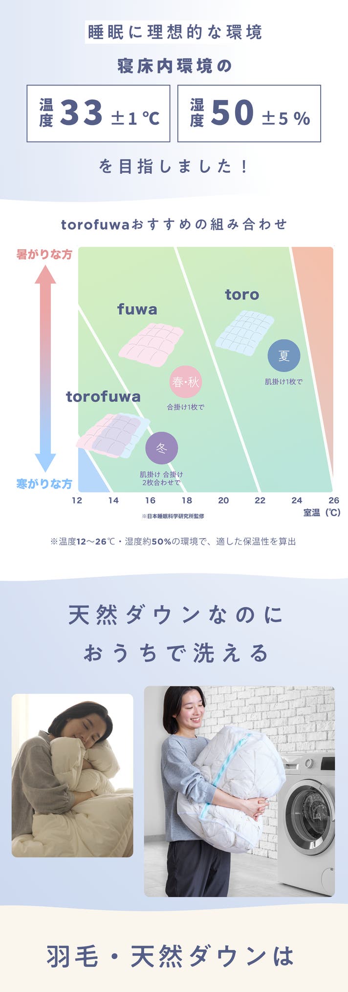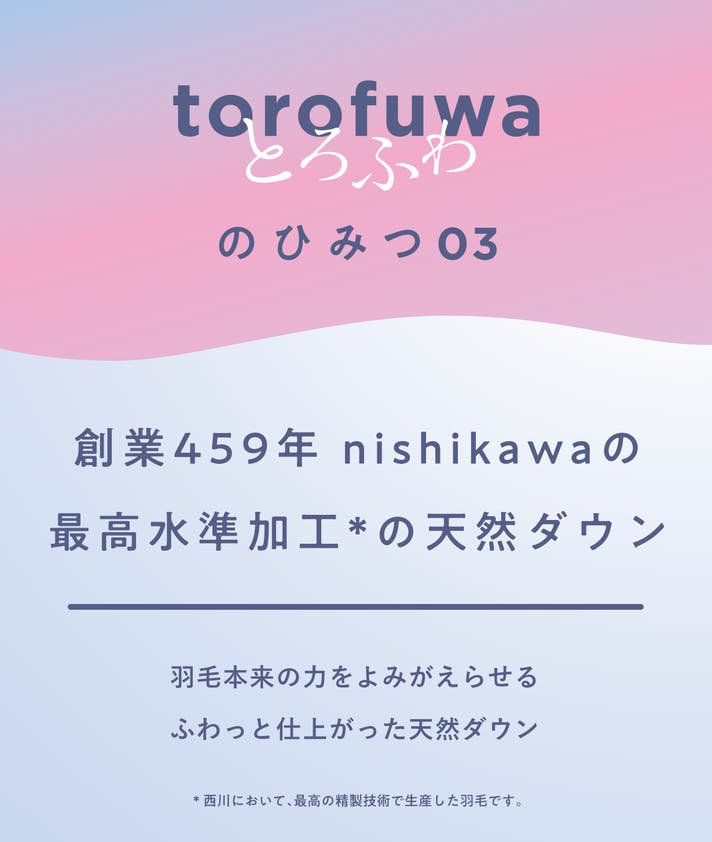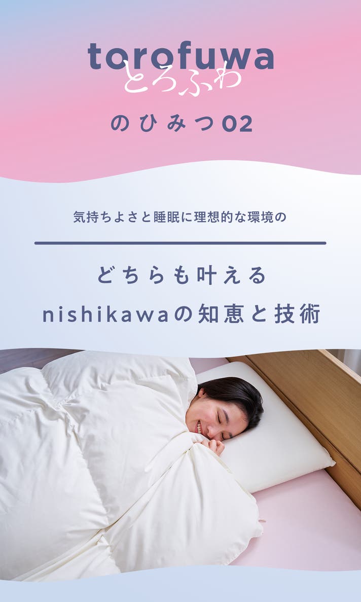 torofuwaでは誰でもオールシーズン快適に感じられるように、459年培ってきたnishikawaの寝具・睡眠に関する技術と知恵を詰め込みました。