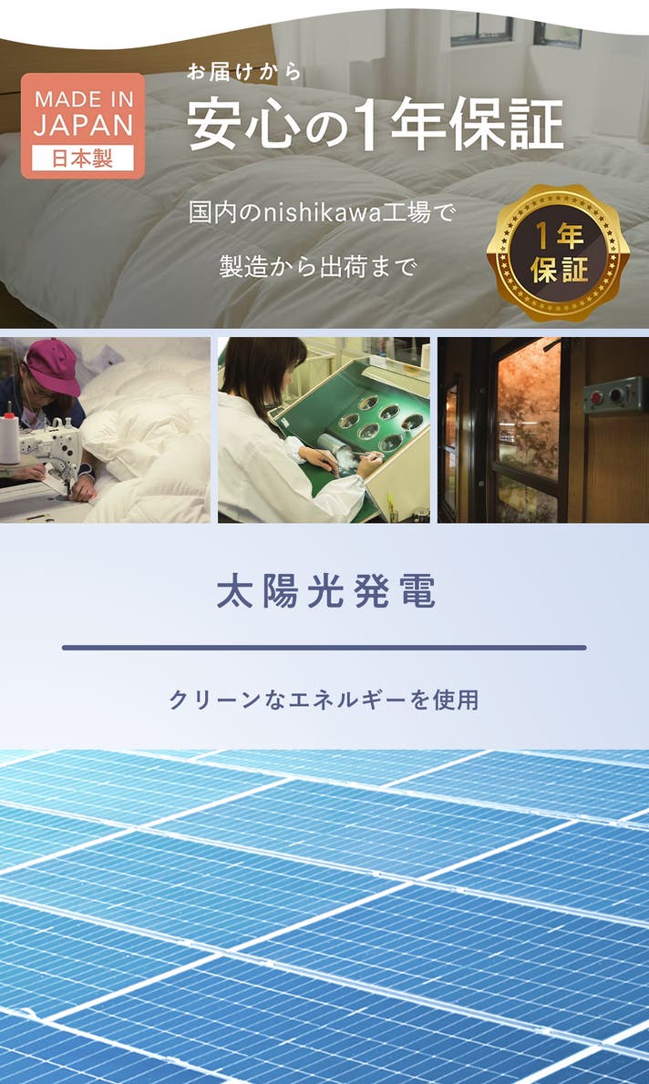 nishikawaでは、太陽光発電によるクリーンなエネルギーを使用しています。羽毛ふとんの製造を行うnishikawaレベックス(nishikawa直営工場)では、羽毛製造工程で使用する電力77万kwhと同等以上の80万kwhを太陽光発電によるクリーンなエネルギーでまかなっています。