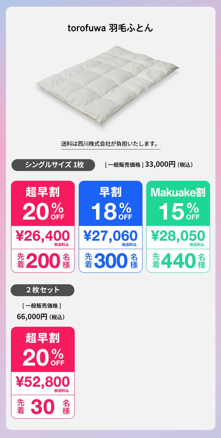 「Makuake(マクアケ)」は、実行者の想いを応援購入によって実現するアタラシイものやサービスのプラットフォームです。このページは、 プロダクトカテゴリの 「オールシーズン使えて、お家で洗える!天然羽毛とろふわ掛け布団|nishikawa」プロジェクト詳細ページです。