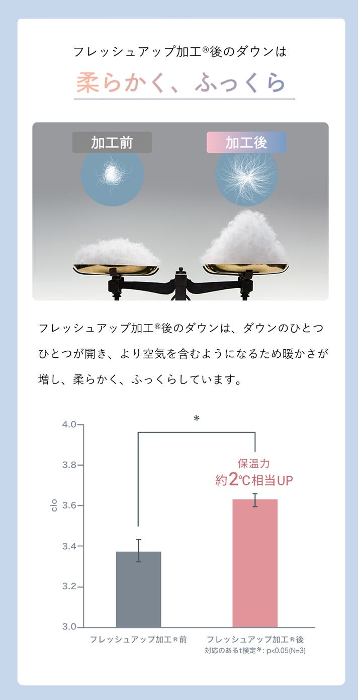 フレッシュアップ加工®︎後のダウンは、ダウン毛先の一つひとつが開いていて、隅々まできれいで豊かに空気を抱えて柔らかく、ふっくらしています。