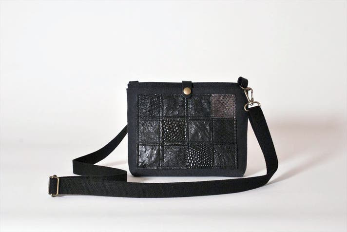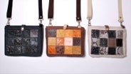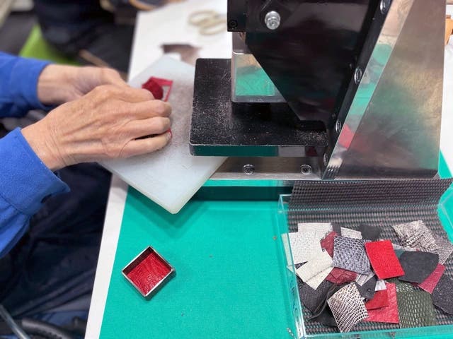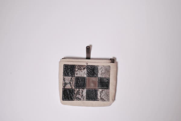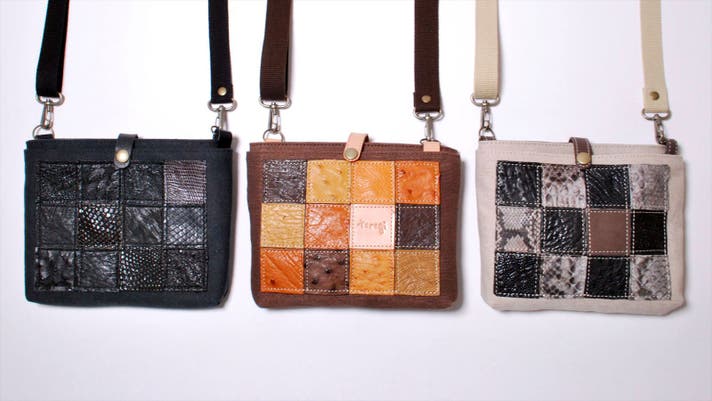シボ革や型押し革、エキゾチック調のものまで、異なる質感を組み合わせて一点一点配置しました。