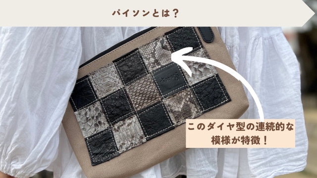 パイソンレザーとは蛇革です。ダイヤ型の連続的な斑紋・模様が特徴で、他のレザーに比べて薄くてしなやかなで、牛革同様にエイジングを体感できます。美しさと、ワイルド感が個性的なデザインを作り出します。