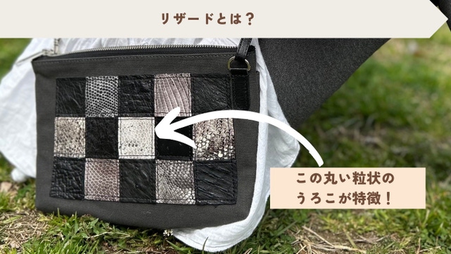 トカゲの革です。細かくて粒の揃った独特の体鱗の形状が特徴で、耐久性にも優れています。キメが細かく美しさが魅力的な革です。手触りはしっとり滑らかで柔らかい革で、ワイルドでありながらも上品なデザインになっています。