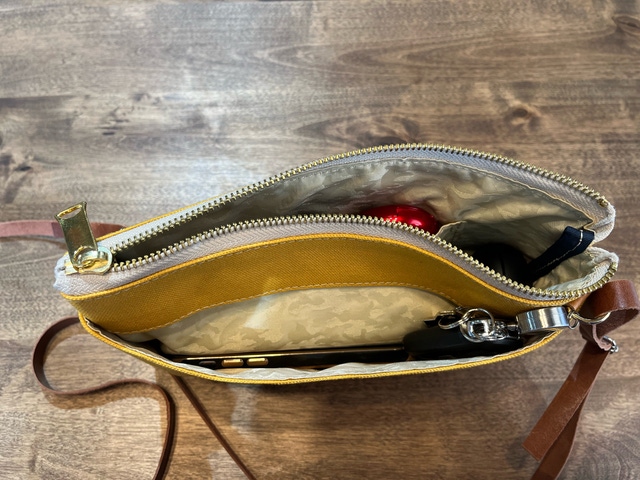 マチ幅がポイント! デザインを崩さない幅を何度もテストし5ミリ単位で調整しました。長財布がチャックに引っ掛からずに出し入れ出来る事にこだわり、車の鍵・イヤホン・コンパクトケース・リップなどの小物を入れても、バッグが膨れないように調整してマチ幅を決定!