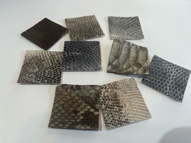 【日本リ・ファッション協会】様から高級カバンを制作して出た端材のエキゾチックレザーがあるとご連絡を頂き、たくさんのエキゾチックレザーを譲り受ける事が出来ました。エキゾチックレザーは革の中でも希少で、なかなか手に入れる事は出来ない高級な革です。