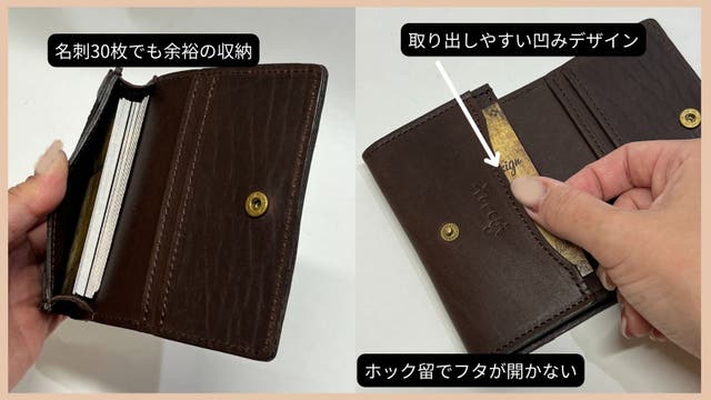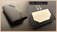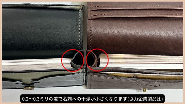 枚数が入るようマチ幅を広げることで、収納時にマチが内側に折り込まれ、名刺にあたります。その「干渉」が小さくなるマチ幅にしているので、名刺の出し入れがスムーズにできます。