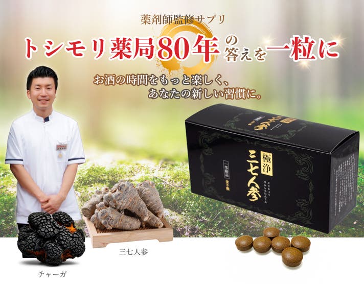 - 三七人参とチャーガ(きのこ)の成分を薬剤師の経験で1年かけ配合したサプリメント