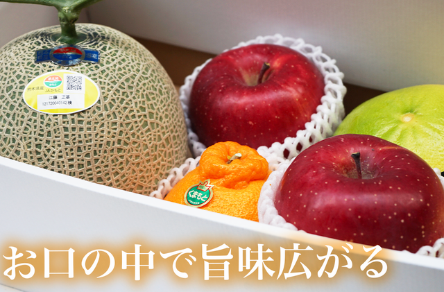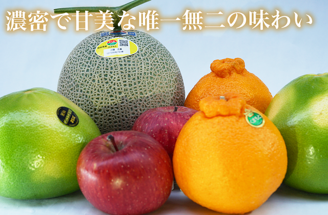 内容量:熊本県産メロン1つ,メロゴールド2つ,長野県産サンフジ特秀2つ,熊本県産デコポン2つ