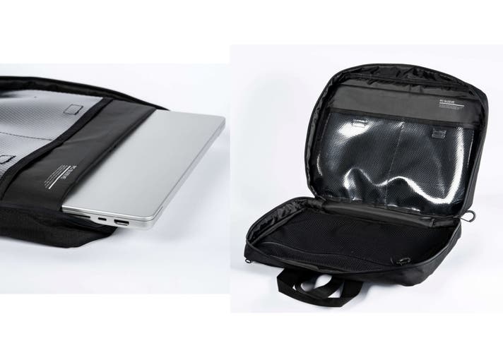 内部:A層サイドポケット(ガジェットポケット、バックル付きキーリング、ペン差し)、B層ファスナー付きメッシュポケット、C層ウレタン入りPCスリーブ(PCVポケット付き)