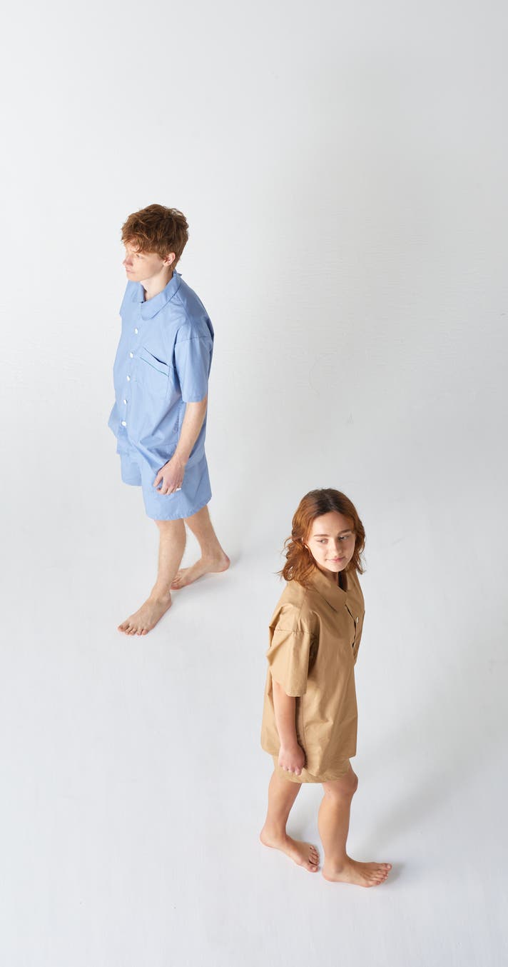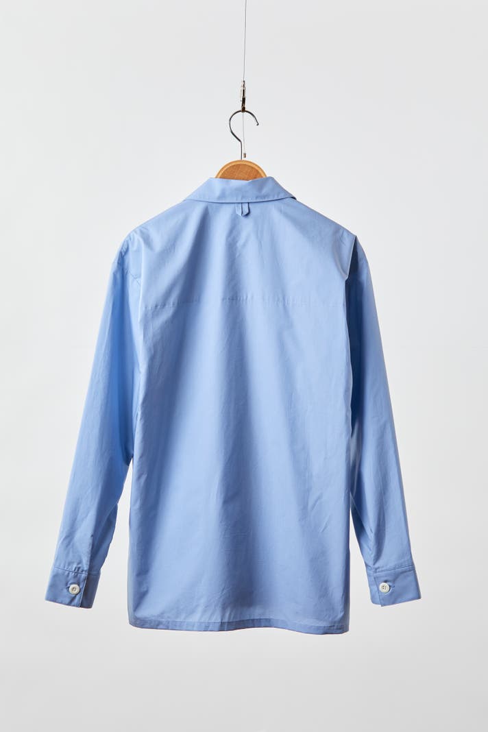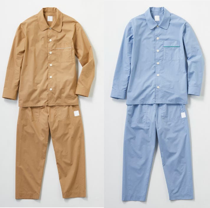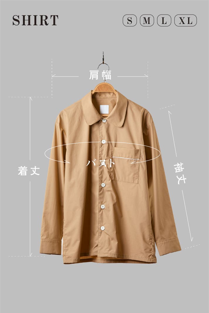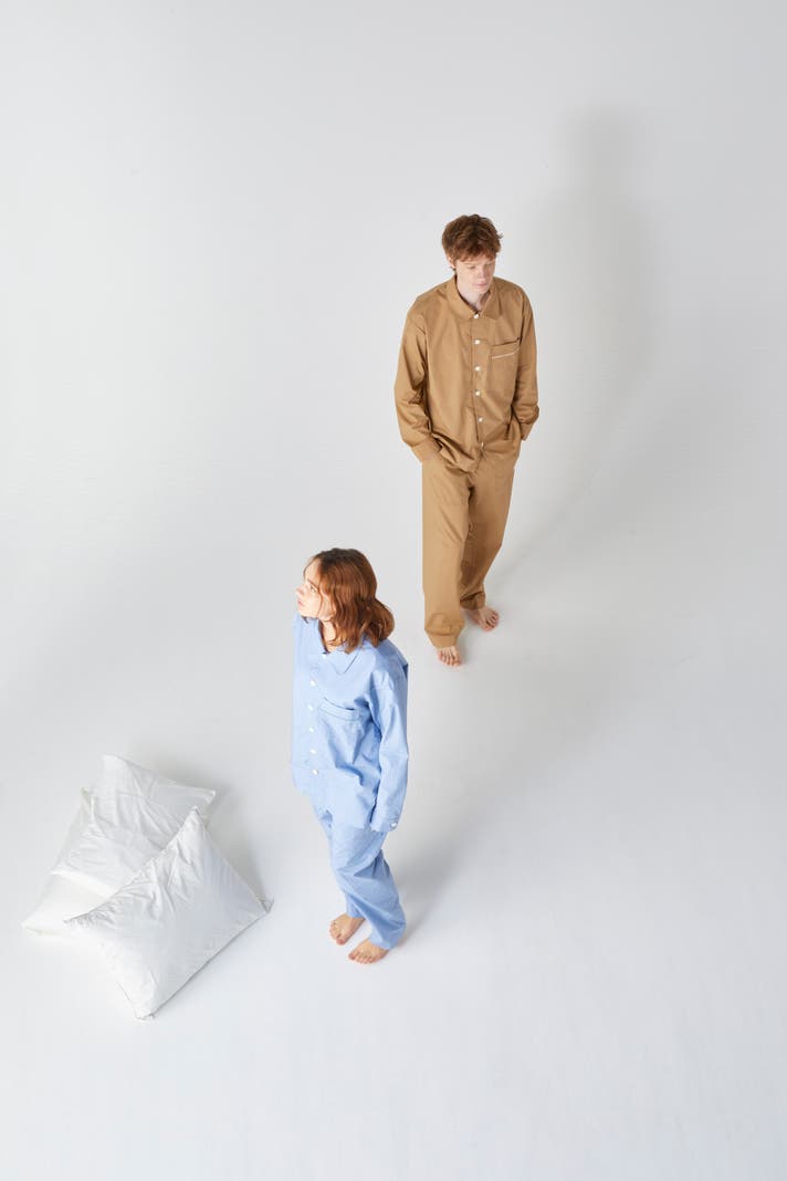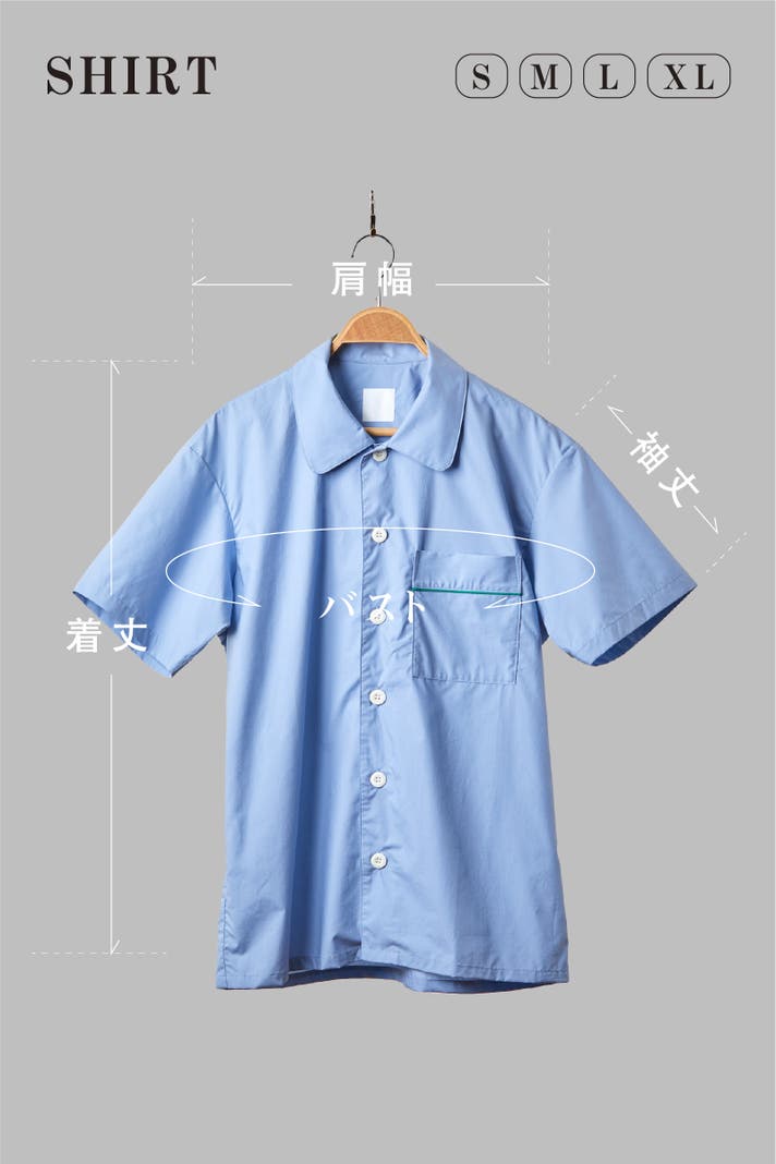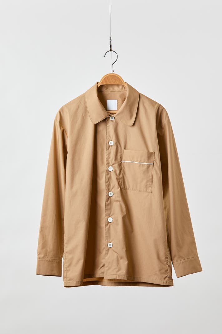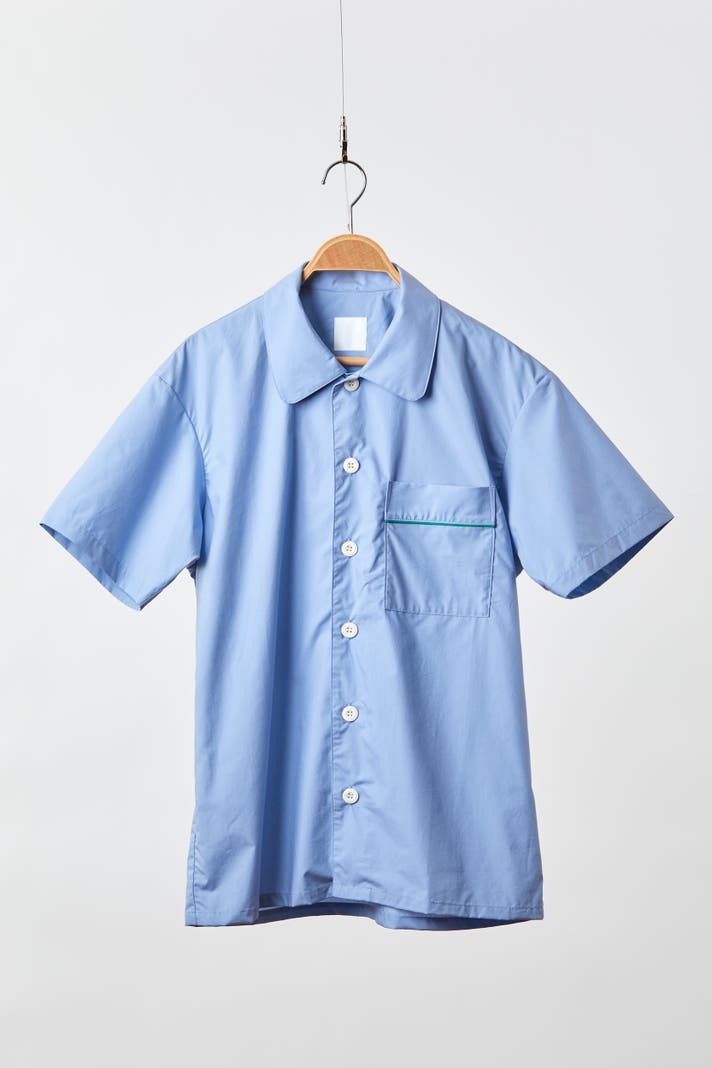 睡眠時に着用を想定して設計。襟のシェープを少し丸く、胸ポケットのパイピングと少し大きめにあしらったホワイトのボタンがポイントです。(セットアップでの販売)