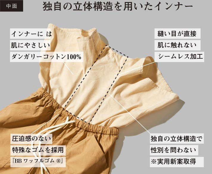 下着代わりのインナーがあることで、体を密閉することなく、歩くたび、寝返りをうつたびに風が通る。この通気性の良さからムレを軽減。デリケートゾーンに熱がこもることを防ぎます。