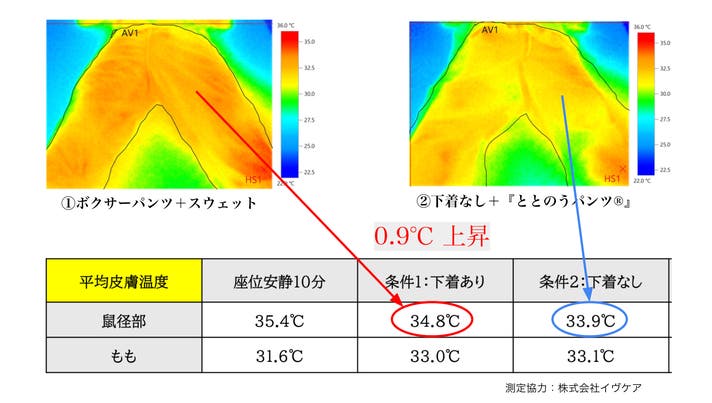 その結果、ボクサーパンツを履いた①よりも、下着なしで『ととのうパンツ®︎』を履いた②において、鼠蹊部からデリケートゾーンにかけての温度がやや低く映る傾向が確認されました。これは、独自構造による通気性の違いにより、熱がこもりにくくなる可能性があると考えられます。