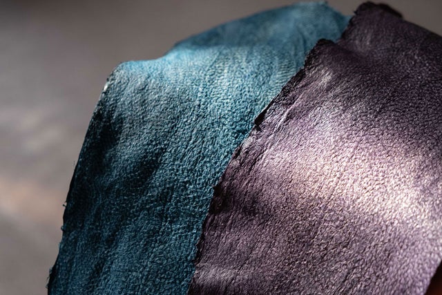 カラーは藍緑と深紫の2色展開となっており、既存の革製品では見かけないような深みのある中間色を目指して染色しています。