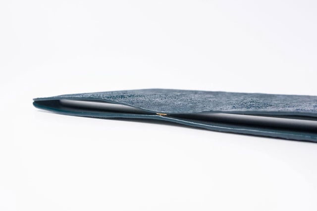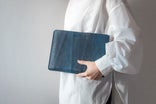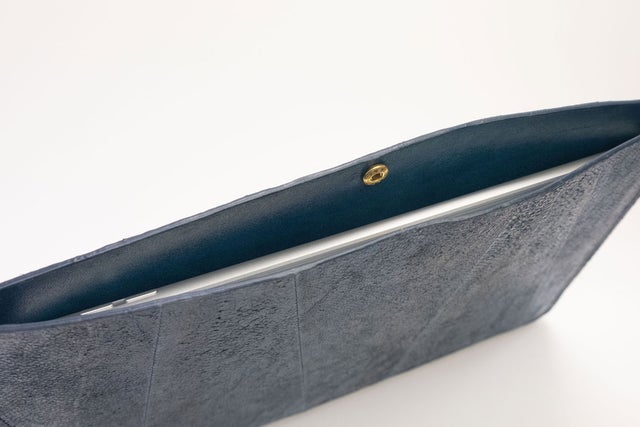 外側はブリのレザー、内側は牛のヌメ革を使用したオールレザーのPC/タブレットケースです。本製品はスリーブ状のケースとなっており、中身をワンアクションで取り出すことができます。蓋のない形状にすることで、凹凸を少なくし鞄への出し入れをスムーズにし、持ち運びやすさも重視しました。シンプルなデザインに仕上げたことでフィッシュレザーの鱗模様が全面に感じられるようになっています。