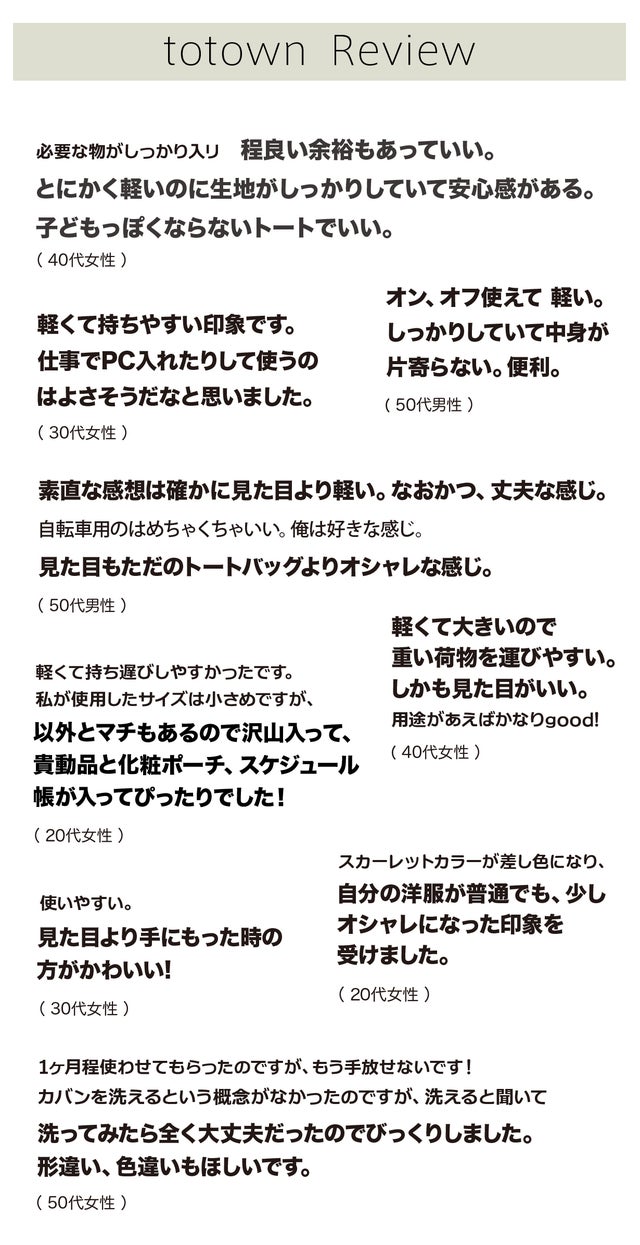 このトートバッグ『totown:トゥータウン』は、『とても軽く』、洗濯機などで『まるッと水洗い』ができてお手入れが簡単!