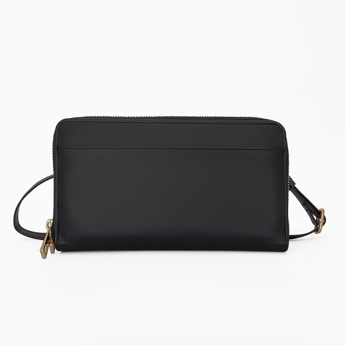 スマホは裏側の透明ポケットへ、カードや紙幣・小銭は財布側へ。チケットやメモも一緒に収納できます。