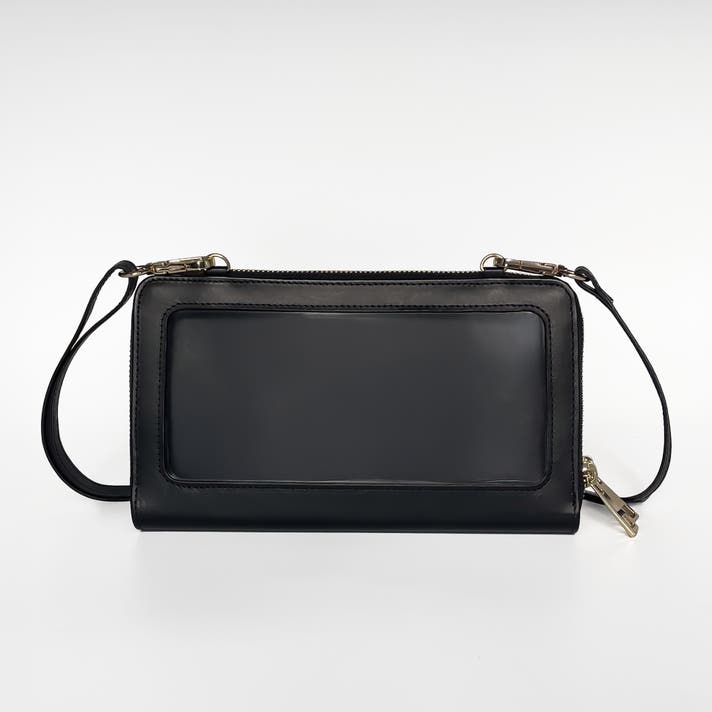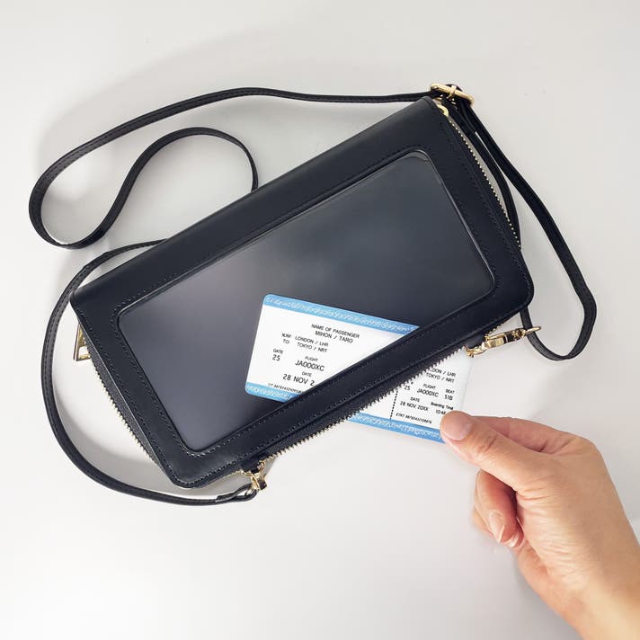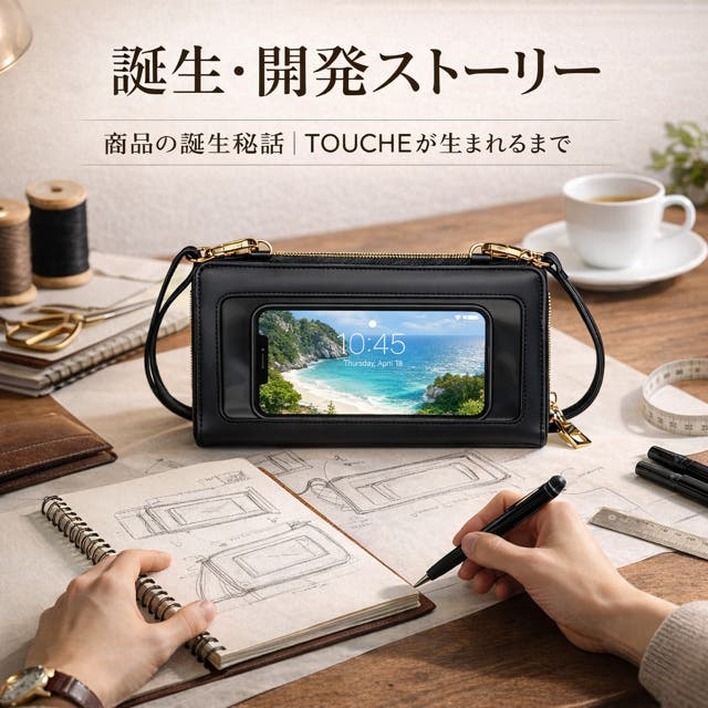 TOUCHEは「中身を取り出さずに確認・操作できたら」という日常の小さな不便から生まれました。裏側の透明ポケット越しにスマホ操作やチケット確認ができ、移動中やレジ前でも取り出さずに確認できる設計です。ダブルファスナー構造により、財布として使う収納部と透明ポケット側を明確に分離し、使いやすさと整理性を両立しています。