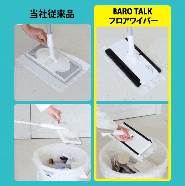 BARO TALK フロアワイパーは、とにかく使いやすさを追求しました。市販のほとんどのクリーナーシートに対応しているため、今お使いのものをそのままご使用いただけます。これからは、お掃除中だけでなく、お掃除の前も後もスマートかつスピーディーに行いましょう!