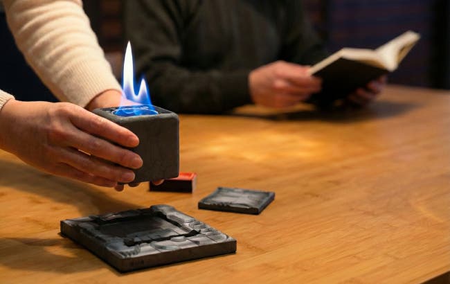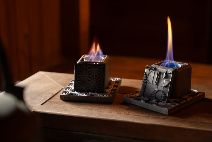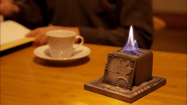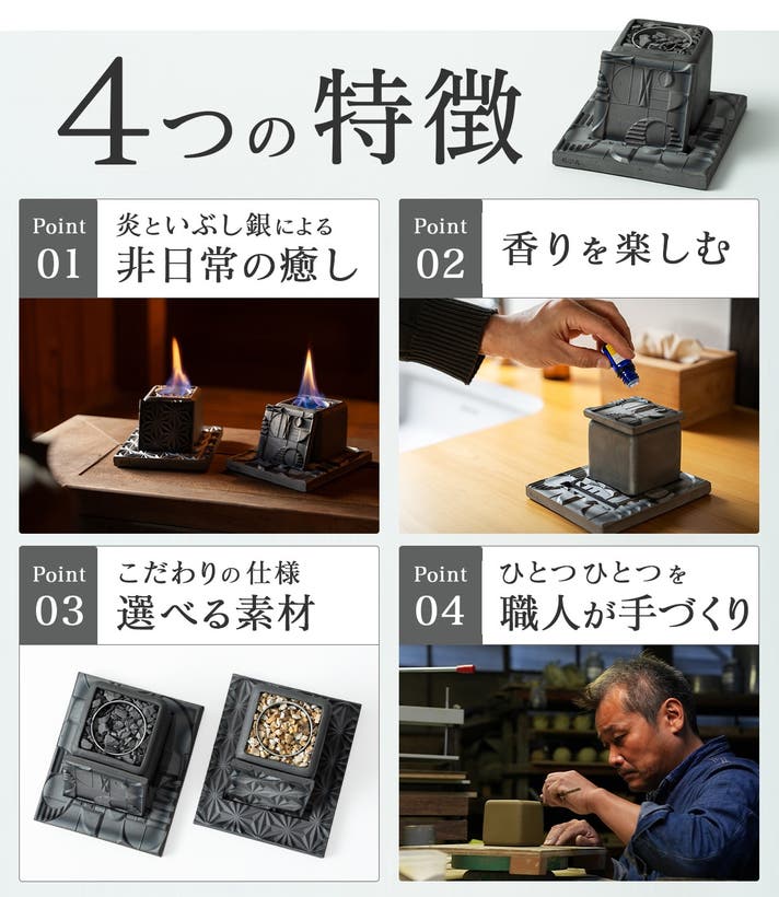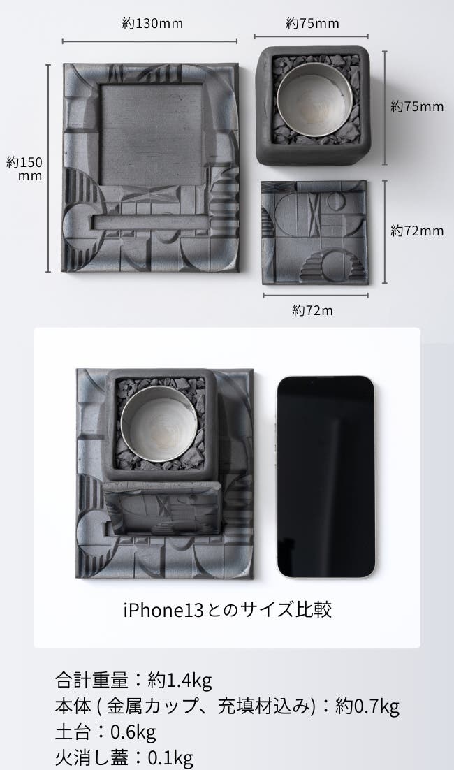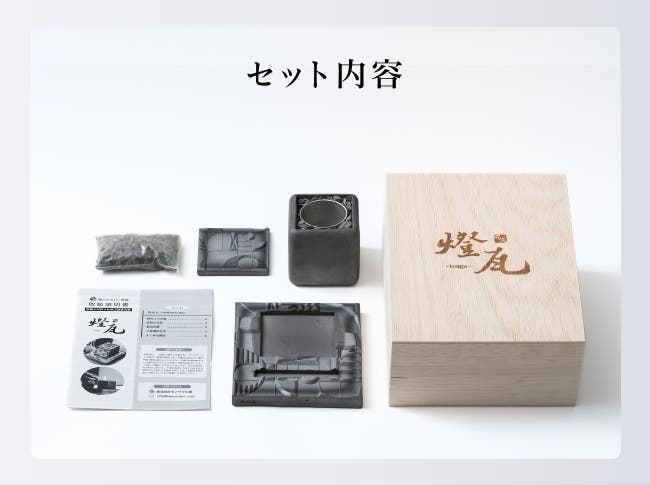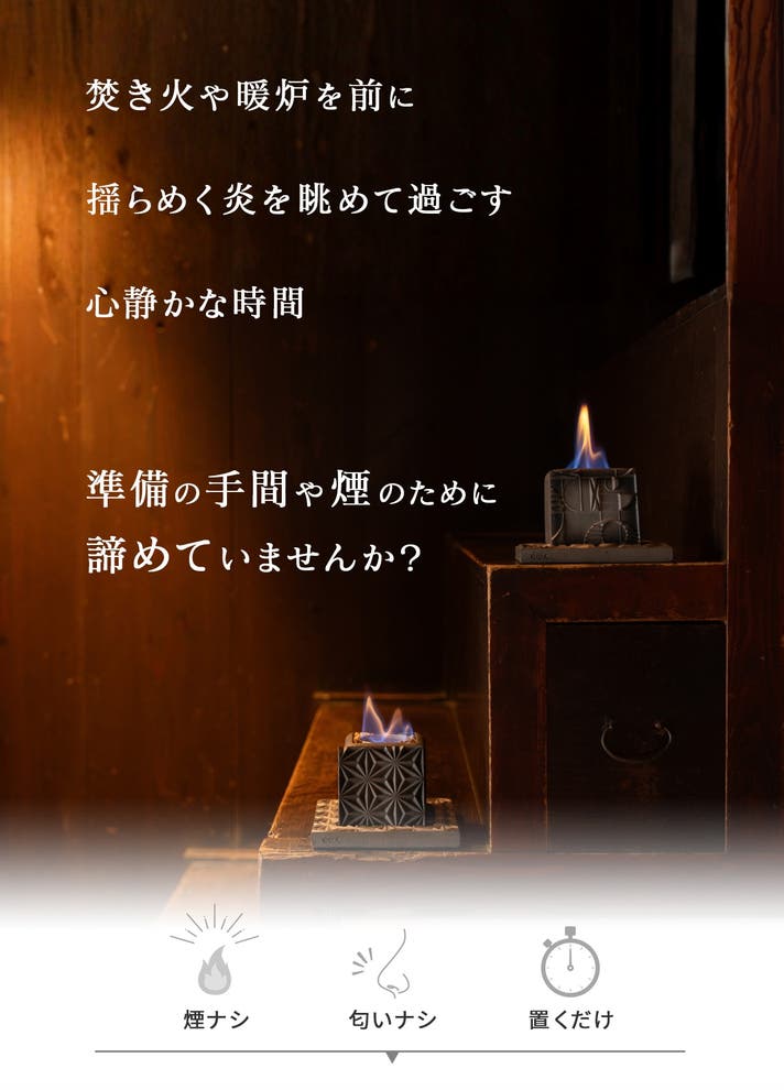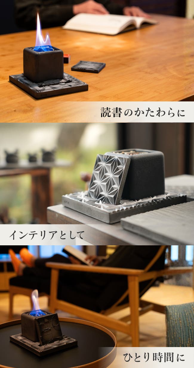 燃焼中も本体は暖かくなる程度なので手で触れられます。伝統の素材を活かしながら、火傷の防止に配慮した設計です。