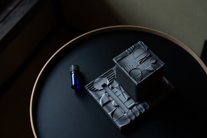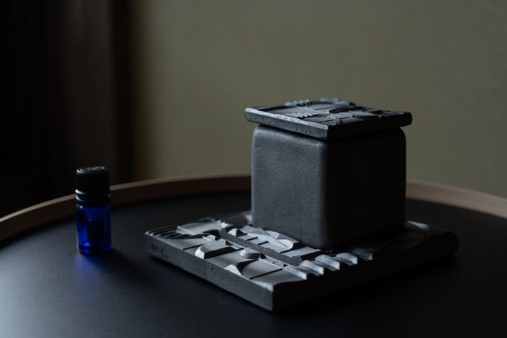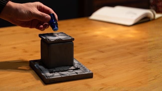 火消し蓋に精油を数滴垂らしてください。 菊間瓦は「多孔質」素材です。微細な孔が無数にあるため、精油をすっと吸収し、瓦に残る余熱で香りをふわりと広げてくれます。