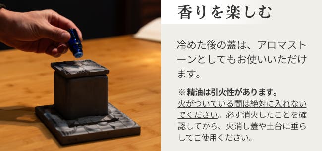 ※ご注意: 精油は引火性があります。火がついている間は絶対に入れないでください。必ず消火したことを確認してから、火消し蓋の上に垂らしてご使用ください。