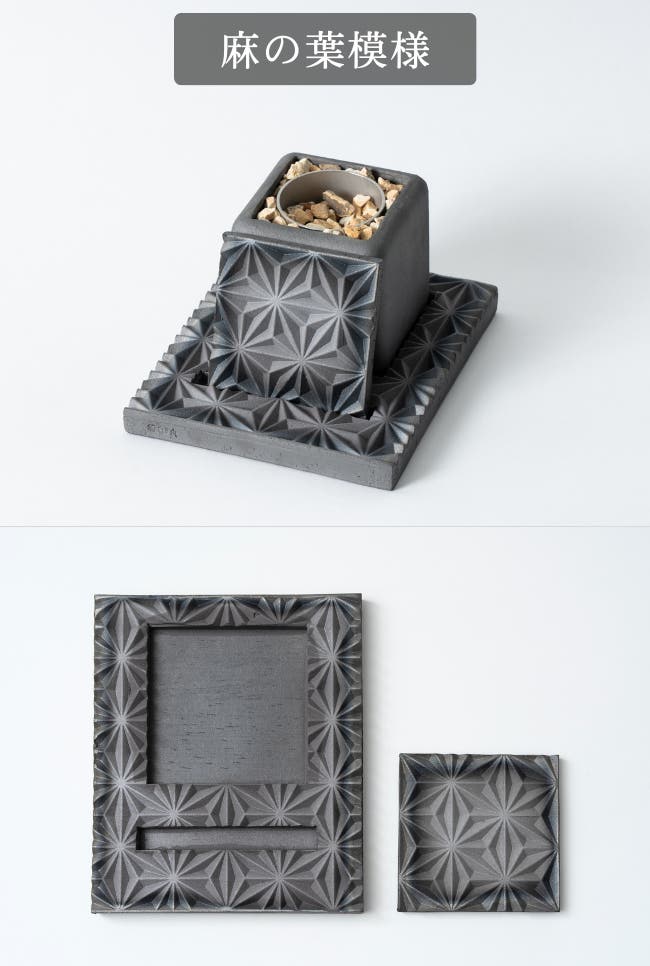 台のホルダーには、火消し蓋を立てて置ける専用の凹みを設けました。蓋の紛失を防ぐとともに、瓦の繊細な紋様を愉しむことができます。