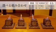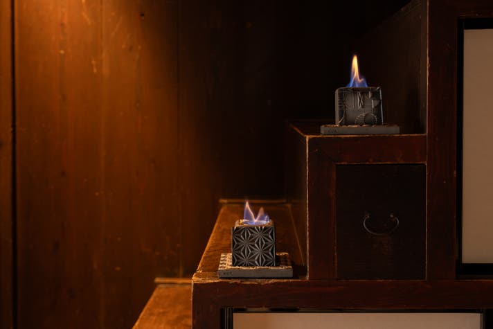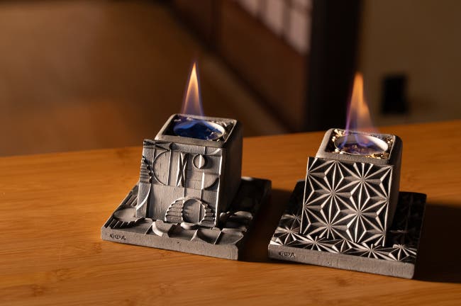 炎が揺れるたび、幾何学模様に影が落ち、いぶし銀の色合いが静かに輝き始めます。炎のゆらぎは「1/fのゆらぎ」と呼ばれ、自然界のリズムを感じる、優しく心地よい揺らめきです。