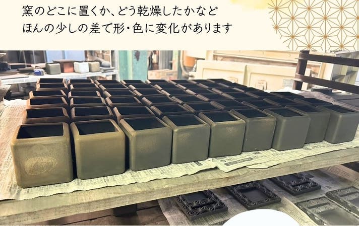 塗料や釉薬は一切使わず、土と炎、そして窯の中の雰囲気だけで色を生み出します。職人の技術が成せる業です。焼き物のため、一つ一つ表情が異なります。ただ一つのお品物としてお楽しみいただけます。