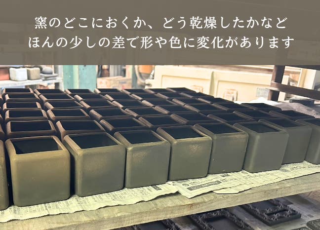 A. 焼き物のため、一点ごとに個体差があります。天然の素材を高温の炎で焼き上げる工程上、窯の中での位置や温度の変化により、表面の色の濃淡やムラの出方に差異が生じます。均一な工業製品とは異なり、一つとして同じものはございません。これは手づくりの焼き物ならではの味わいとして、あらかじめご了承ください。