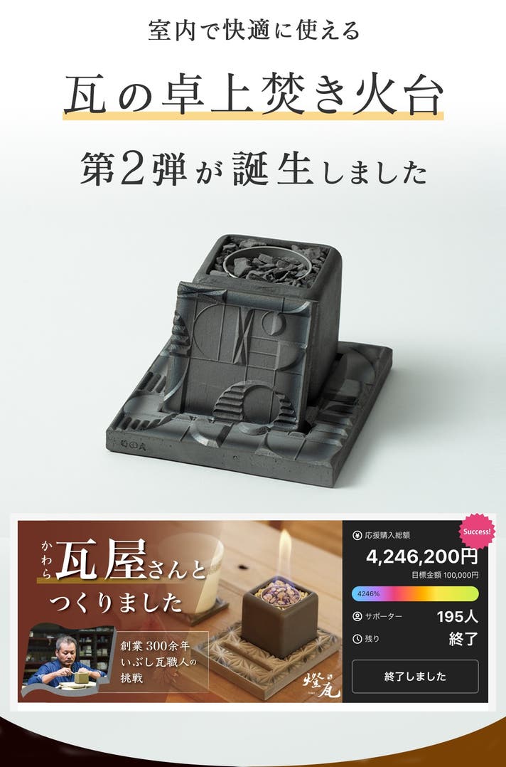 「Makuake(マクアケ)」は、実行者の想いを応援購入によって実現するアタラシイものやサービスのプラットフォームです。このページは、 プロダクトカテゴリの 「気軽に炎のゆらぎを楽しむ贅沢。日本の伝統技術を使ったいぶし銀の卓上焚き火台。」プロジェクト詳細ページです。