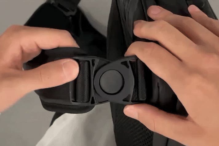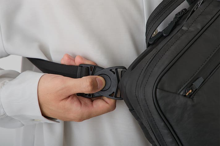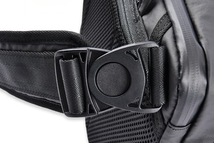 本体とショルダーベルトを繋ぐバックルには、Duraflex製の旋回パーツを採用しました。