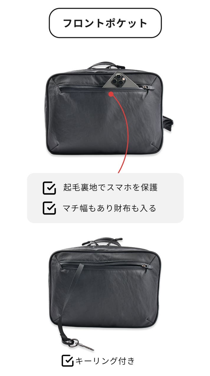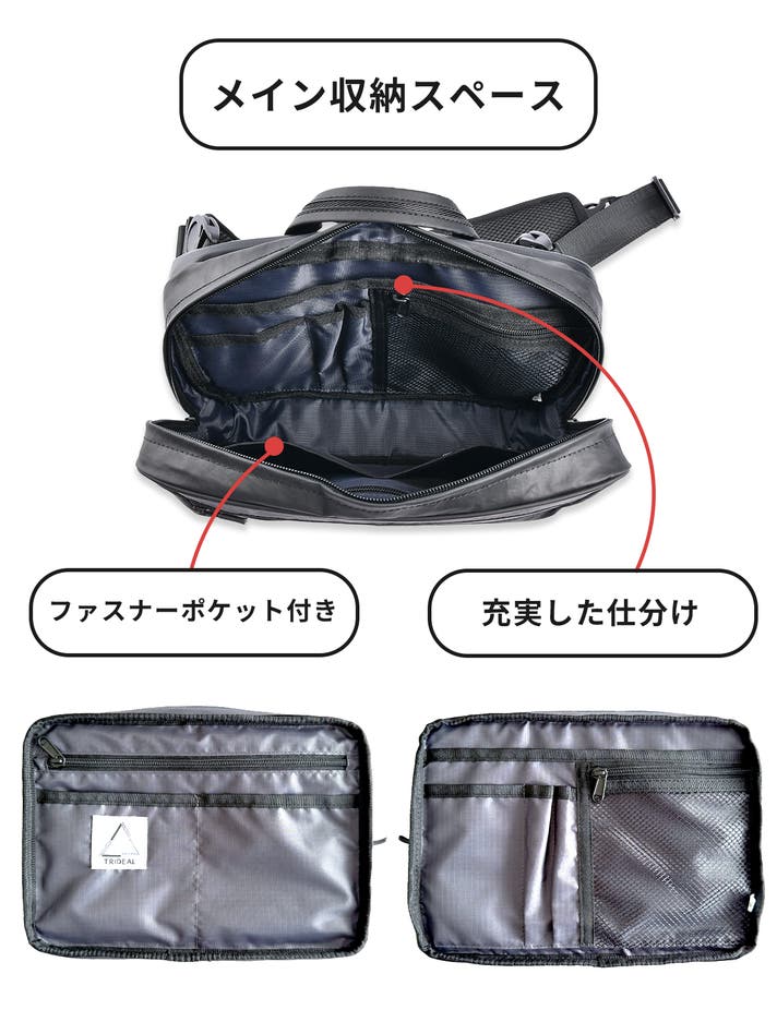 タブレット、財布、スマホ、イヤホン、鍵など必需品をすっきり整理できるポケット構造を備えています。